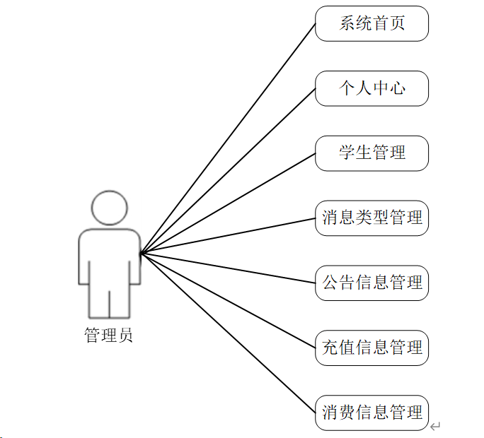 管理员端的功能主要是开放给系统的管理人员使用,能够对系统首页、个人中心、学生管理、消费类型管理、公告信息管理、充值信息管理、消费信息管理进行查看,修改和删除等,对系统整体运行情况进行了解。