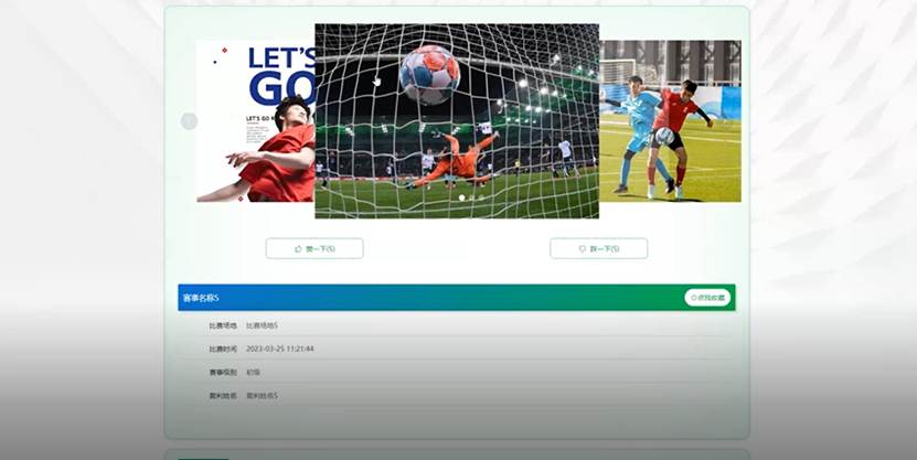 足球赛事:在足球赛事页面的输入栏中输入赛事名称、比赛场地、比赛时间、赛事级别、裁判姓名进行查询,可以查看到足球赛事详细信息,并根据需要进行赞或收藏操作;足球赛事页面如图5-3所示: