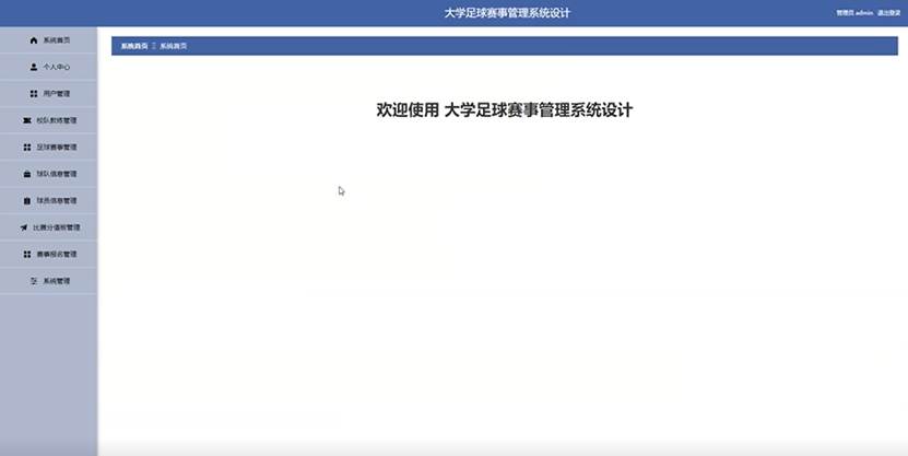 管理员进入主页面,主要功能包括对系统首页、个人中心、用户管理、校队教练管理、足球赛事管理、球队信息管理、球员信息管理、、比赛分值板管理、赛事报名管理、系统管理等进行操作。管理员主页面如图5-6所示: