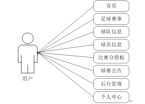 用户:用户进入系统可以实现对首页、足球赛事、球队信息、球员信息、比赛分值板、球赛公告、后台管理、个人中心等信息进行操作。用户用例如图3-2所示。