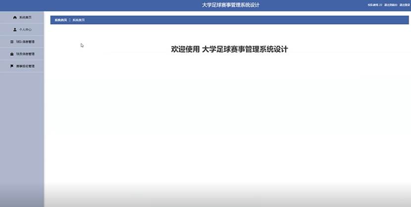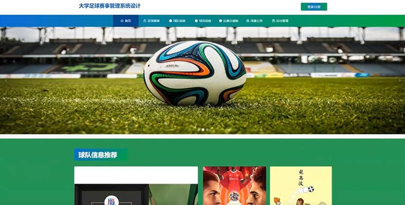 当人们打开系统的网址后,首先看到的就是首页界面。在这里,人们能够看到大学足球赛事管理系统设计的导航条,通过导航条导航进入各功能展示页面进行操作。系统首页界面如图5-1所示: