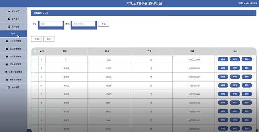 管理员点击用户管理。在用户页面输入姓名和性别进行查询、新增或删除用户列表,并根据需要对用户详情信息进行详情、修改或删除操作;如图5-7所示: