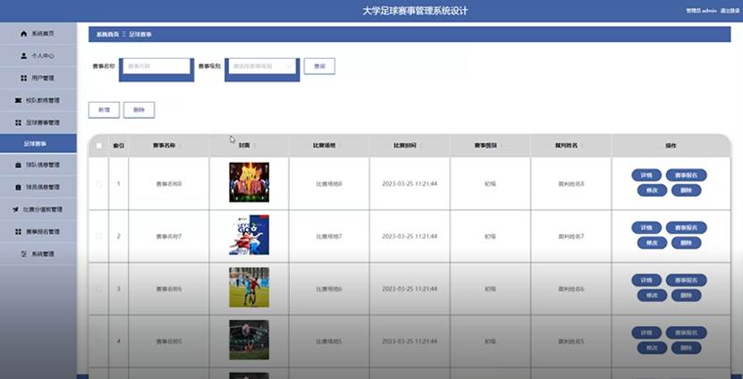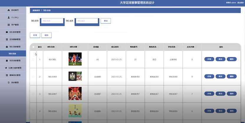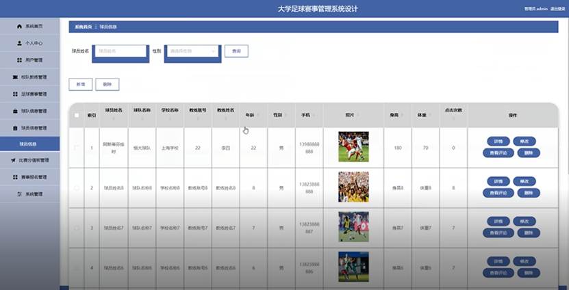 系统涵盖管理员、用户、校队教练三大角色功能,核心模块包括系统首页、个人中心、用户管理、校队教练管理、足球赛事管理、球队信息管理、球员信息管理、比赛分值板管理、赛事报名管理等。管理员统筹平台管理;校队教练可维护球队与球员信息;用户可浏览赛事、查看比分。系统支持赛事分类检索、报名审核、比分统计等功能,实现了足球赛事全流程的数字化与规范化。
