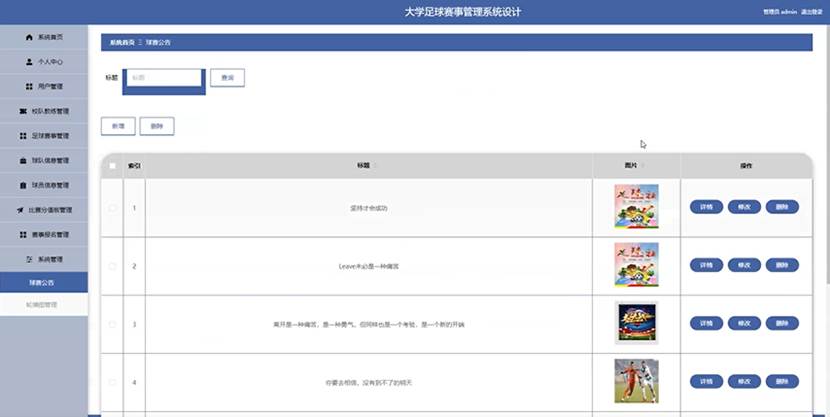 管理员点击系统管理。在球赛公告页面输入标题进行查询、新增或删除球赛公告列表,并根据需要对球赛公告详情信息进行详情、修改或删除操作;还可以对轮播图管理进行操作;如图5-14所示: