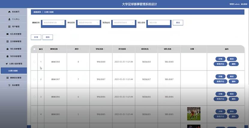 管理员点击比赛分值板管理。在比赛分值板页面输入赛事名称、学校名称、球员姓名、球队名称进行查询、新增或删除比赛分值板列表,并根据需要对比赛分值板详情信息进行详情、修改、查看评论或删除操作;如图5-12所示: