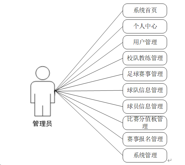 管理员模块:管理员是系统中的核心用户,管理员登录后,可以对后台系统进行管理。主要功能有系统首页、个人中心、用户管理、校队教练管理、足球赛事管理、球队信息管理、球员信息管理、比赛分值板管理、赛事报名管理、系统管理等功能。管理员用例如图3-1所示。