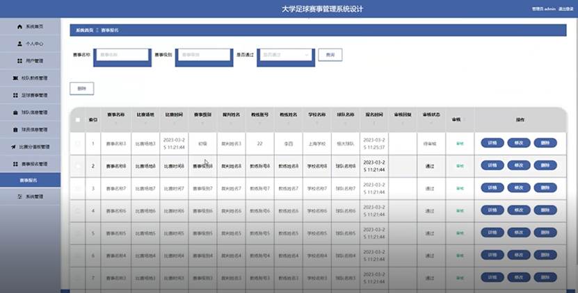 管理员点击赛事报名管理。在赛事报名页面输入赛事名称、赛事级别和选择是否通过进行查询或删除赛事报名列表,并根据需要对赛事报名详情信息进行详情、修改或删除操作;如图5-13所示: