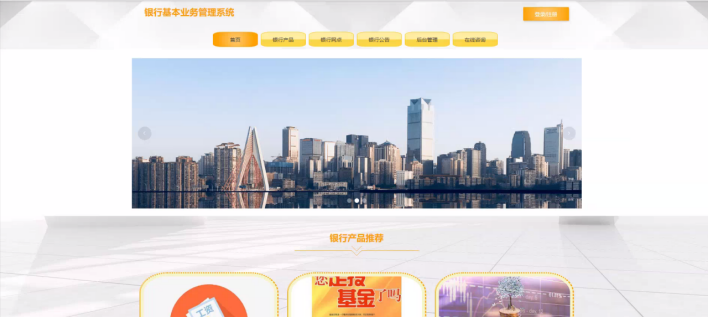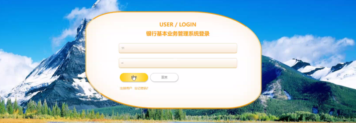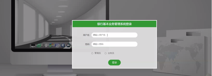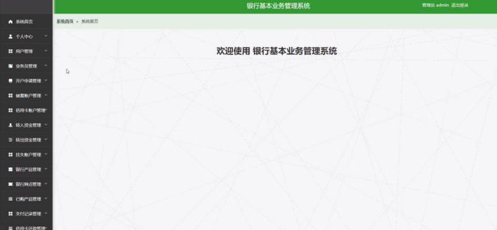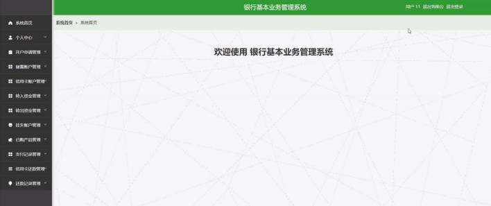 当人们打开系统的网址后,首先看到的就是首页界面。在这里,人们能够看到银行基本业务管理系统的导航条,系统首页界面如图5-1所示: