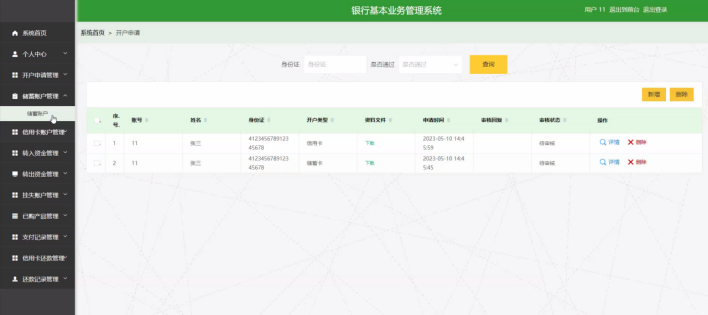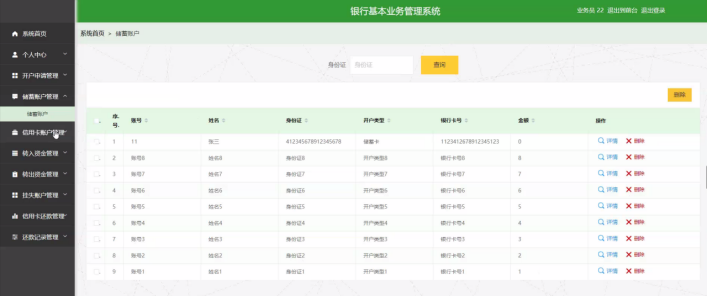 储蓄账户管理:支持查看和管理储蓄账户信息,涵盖账号、姓名、身份证、开户类型、银行卡号、金额等,可执行删除等操作。