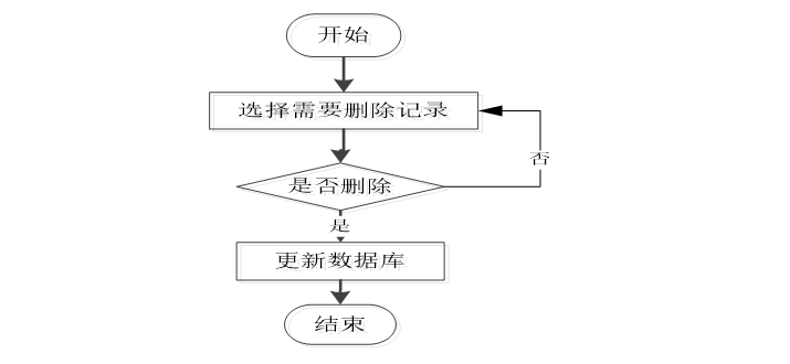 最后为删除信息页面。进入该页面后,用户可以对所要删除的信息进行选择,选择好删除的内容后,会有一个“是否确认删除”的提示框,操作者可以根据自己的意愿来选择“是”或“否”。完成上述操作,系统会自动的对删除的内容进行判断,如果符合删除要求则会成功删除数据记录,并且更新数据库的内容信息;如果删除的数据记录不符合要求,则会有一个“删除失败”的提示框,操作人员需要根据提示来进行修改,修改完成后重新删除知道删除成功。删除信息流程图如图3-3所示:
