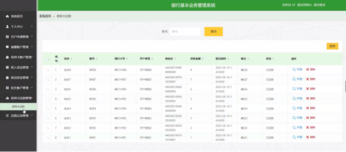 信用卡还款管理:用户和业务员可以查看和管理信用卡还款记录,如姓名、账号、银行卡号、开户类型、身份证、还款金额、登记时间、备注、状态等信息,可执行删除等操作。
