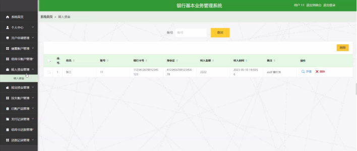 转入资金管理,用户可在转入资金管理页面查看姓名、账号、银行卡号、身份证、转入金额、转入时间、备注等内容,还可进行删除等操作,如图5-7所示。