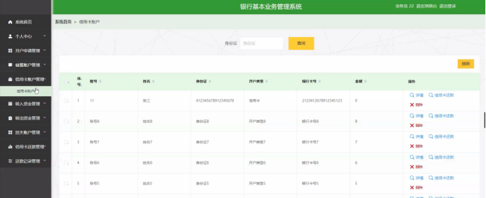 信用卡账户管理:用户和业务员可以查看和管理信用卡账户信息,如账号、姓名、身份证、开户类型、银行卡号、金额等,支持删除等操作。