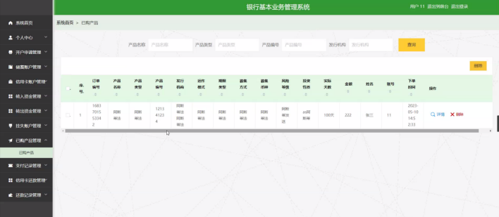 已购产品管理:用户和业务员可以查看和管理已购产品信息,涵盖订单编号、产品编号、产品名称、产品类型、发行机构、运作模式、期限类型、募集方式、募集币种、风险等级、投资性质、实际天数、金额、姓名、账号、下单时间等,可执行删除等操作。
