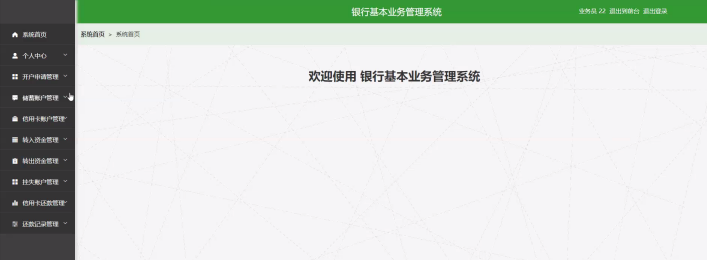 业务员通过登录进入系统可查看个人中心、开户申请管理、储蓄账户管理、信用卡账户管理、转入资金管理、转出资金管理、挂失账户管理、信用卡还款管理、还款记录管理等内容,如图5-11所示: