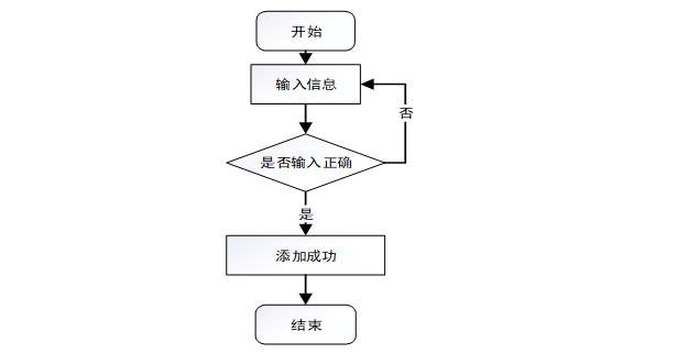 然后是添加信息的页面。进入该页面后,页面会出现一个提示框,示意操作者可以进行信息的添加,从而进行下一步的操作。用户输入想要添加的信息后提交,系统会对输入的内容进行检测。如果检测后输入的信息正确,则会出现“添加成功”的提示框,从而可以进行下一步操作;如果系统检测后检测到想要添加的信息不符合规范要求,则会提示报错,需要进行修改后重新添加。添加信息流程图如图3-2所示: