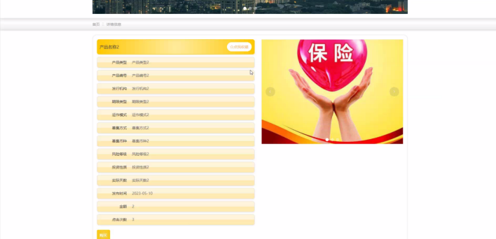 银行产品,用户可在银行产品页面查看产品名称、封面、产品类型、产品编号、发行机构、期限类型、运作模式、募集方式、募集币种、风险等级、投资性质、实际天数、发布时间、金额、点击次数等内容,还可进行收藏或购买等操作,页面如图5-3所示: