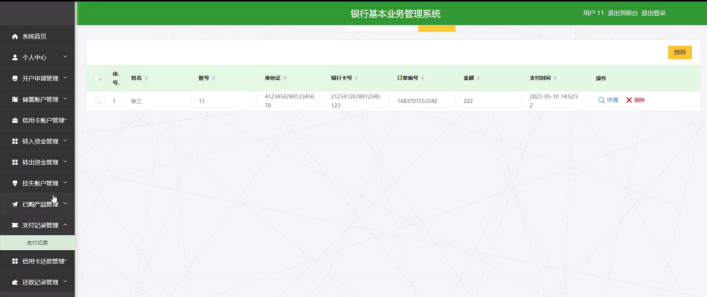 支付记录管理,用户可在支付记录管理页面查看姓名、账号、身份证、银行卡号、订单编号、金额、支付时间等内容,还可进行删除等操作,如图5-9所示: