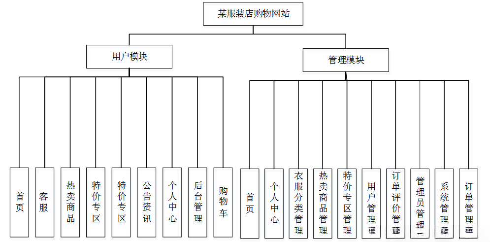 经过系统需求分析,该某服装店购物网站的设计与实现功能结构图如图4-1所示: