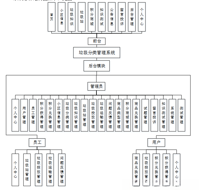 垃圾分类管理系统的建设可以为垃圾分类管理提供帮助,通过对一些基础信息管理实现针对性的安排,可以按照用户的角色权限使不同用户角色看到不一样的信息界面。现根据需求阶段的分析,我们可以大致确定系统需要包含的功能如下图所示: