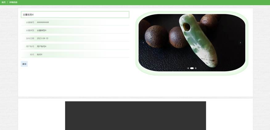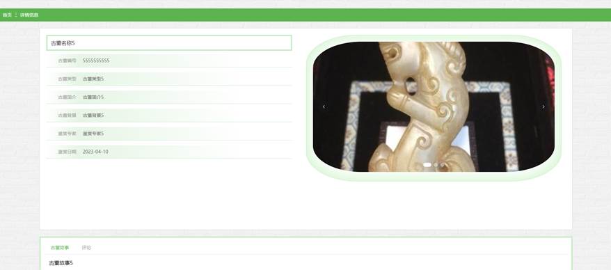 点击古董鉴赏,用户在古董鉴赏页面搜索栏输入古董名称、古董类型,进行查询,还可以查看古董编号、古董名称、古董类型、古董图片、古董简介、古董背景、鉴赏专家、鉴赏日期等详情信息,如图5-6所示。