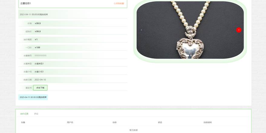 点击古董拍卖,用户在古董拍卖页面搜索栏输入古董名称、古董类型、价格,进行查询,还可以查看古董编号、古董名称、古董类型、古董图片、鉴定书、拍卖日期、价格、起拍价、加价幅度、一口价等信息,如有需要可以下载鉴定书或者收藏、评论等操作,如图5-4所示。