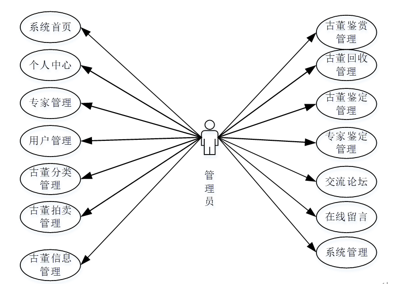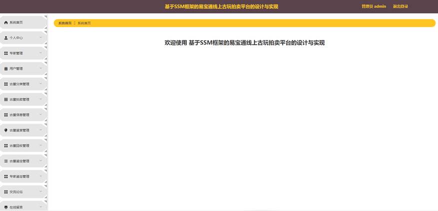 管理员点击登录摁钮页面跳转到易宝通线上古玩拍卖平台对系统首页、个人中心、专家管理、用户管理、古董分类管理、古董拍卖管理、古董信息管理、古董鉴赏管理、古董回收管理、古董鉴定管理、专家鉴定管理、交流论坛、在线留言、系统管理等功能,进行相应操作,如图5-10所示。