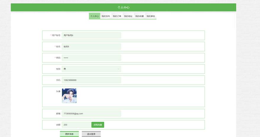 用户点击个人中心,在个人中心页面可以更新个人详细信息,还可以对我的发布、我的订单、我的地址、我的收藏、我的参拍进行详细操作;如图5-8所示:
