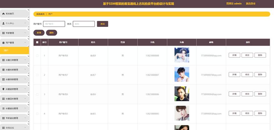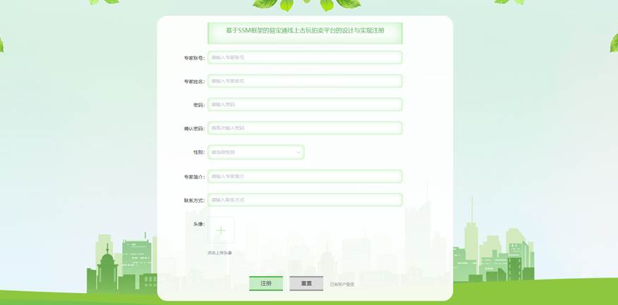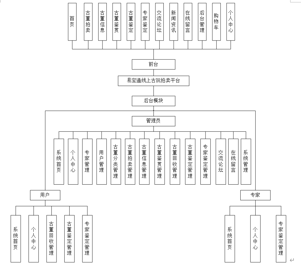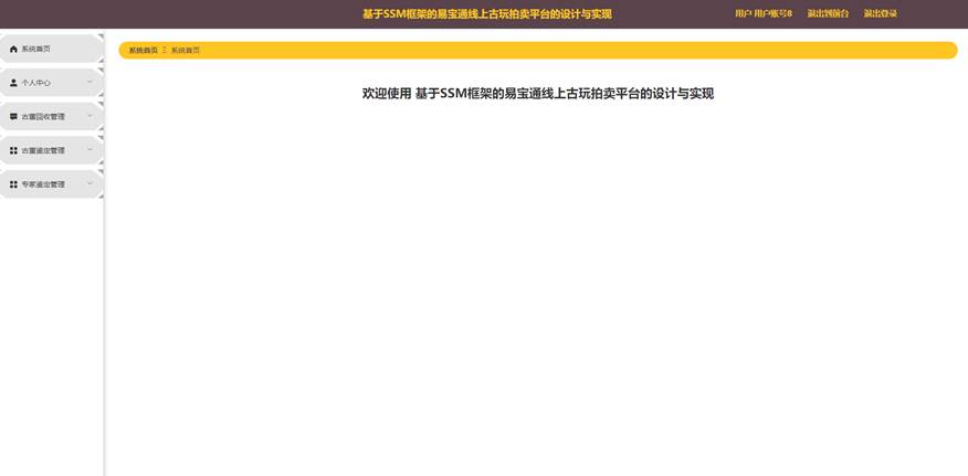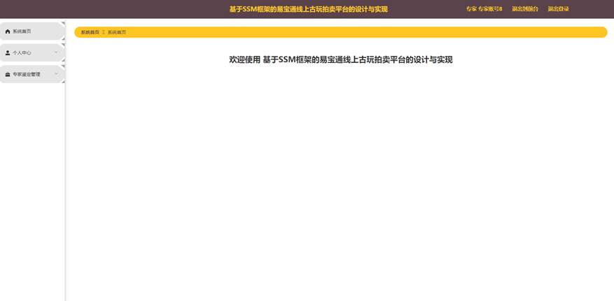 本课题要求实现一套基于SSM框架的易宝通线上古玩拍卖平台的设计与实现,系统主要包括管理员模块和用户、专家模块的功能模块。
