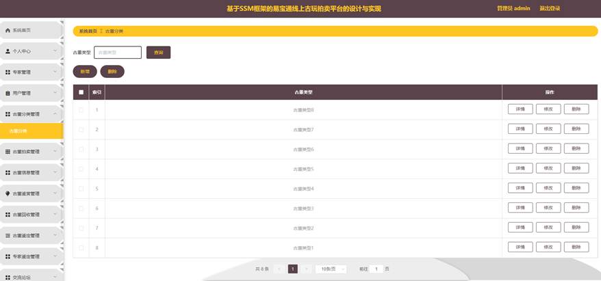 管理员点击古董分类管理,在古董分类管理页面对古董分类等信息,进行查询、新增或删除古董分类等操作。如图5-13所示: