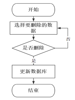 删除操作在系统中并非是必须的,可根据用户及系统的需要来决定是否添加删除功能,删除操作就是使用delete语句将数据库中的某一匹配数据删除,因为此操作会导致用户数据丢失,所以为了避免使用者误按删除键,应在用户点击删除按钮时添加一个提示确认弹窗,当用户确定要删除时,再进行数据库的操作,并且在删除操作完成后要对用户进行反馈。删除信息流程图如图3-9所示。