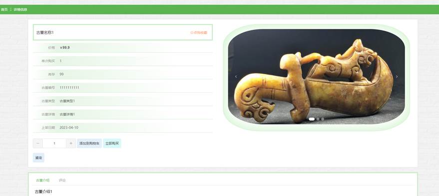 点击古董信息,用户在古董信息页面搜索栏输入古董名称、古董类型、价格,进行查询,还可以查看古董编号、古董名称、古董类型、古董图片、上架日期、单限、库存、价格等信息,如有需要可以添加到购物车、立即购买、收藏或评论等操作,如图5-5所示。