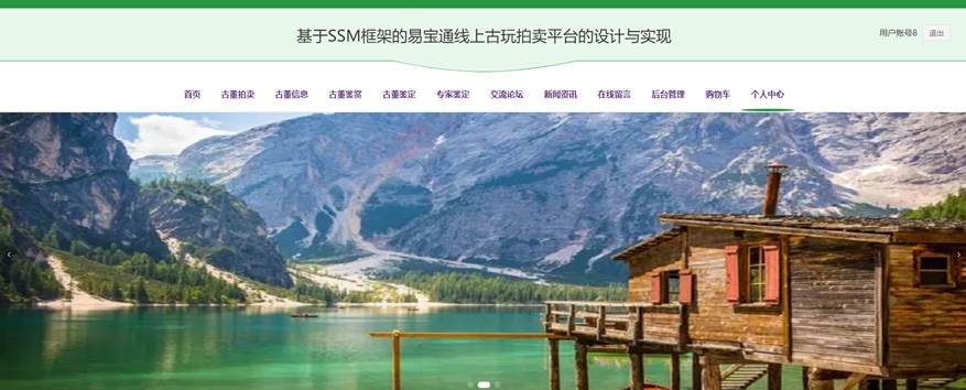 当用户打开系统的网址后,首先看到的就是首页界面。在这里,用户能够看到易宝通线上古玩拍卖平台的导航条显示首页、古董拍卖、古董信息、古董鉴赏、古董鉴定、专家鉴定、交流论坛、新闻资讯、在线留言、后台管理、购物车、个人中心等。系统首页界面如图5-1所示:
