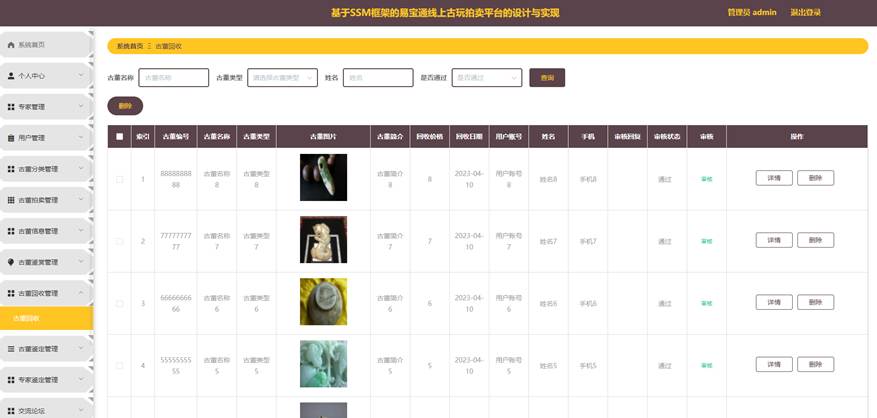 管理员点击古董回收管理,在古董回收管理页面对古董编号、古董名称、古董类型、古董图片、古董简介、回收价格、回收日期、用户账号、姓名、手机、审核回复、审核状态、审核等信息,进行查询或删除古董回收等操作。如图5-17所示: