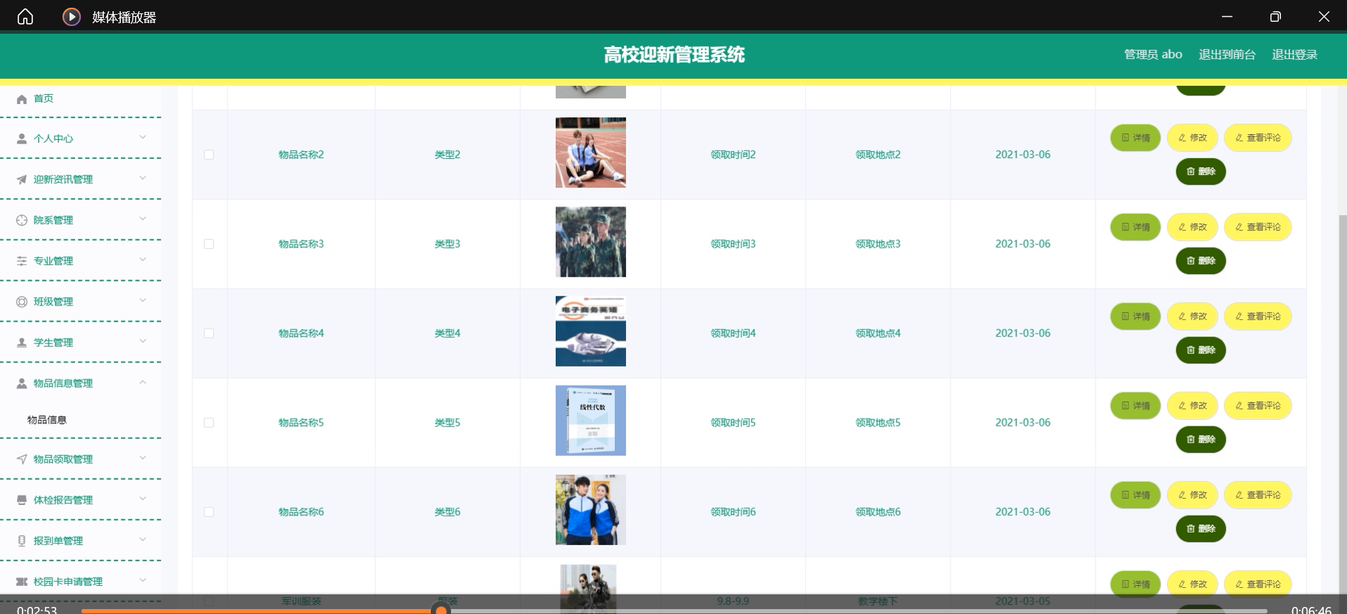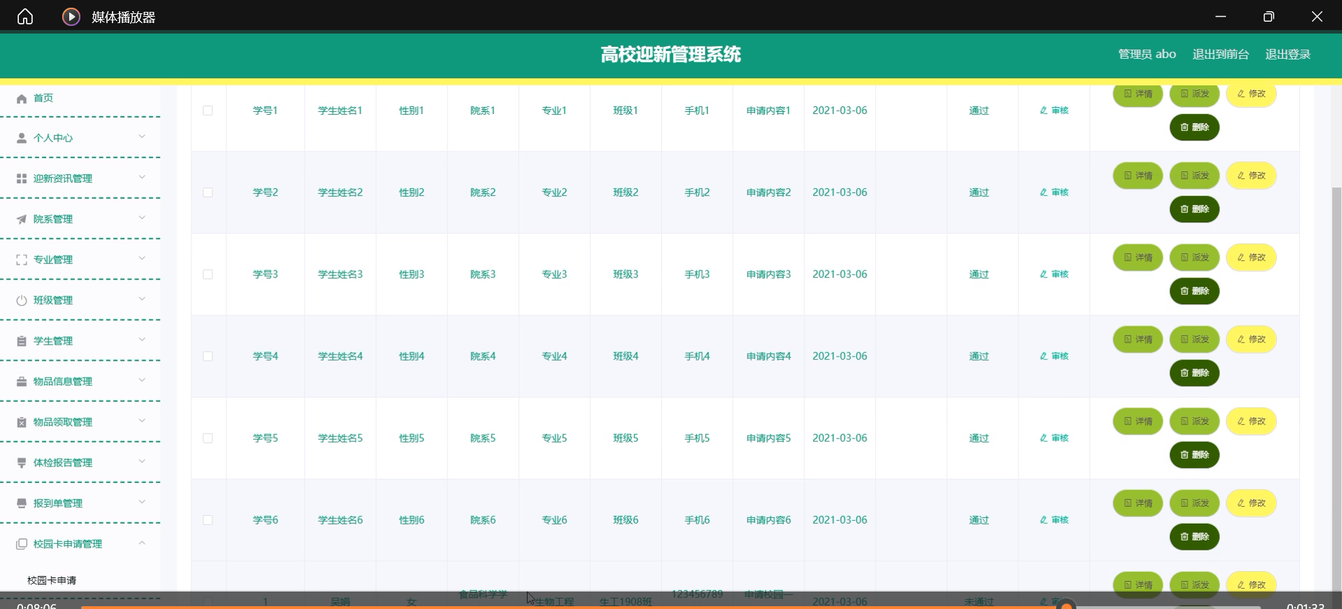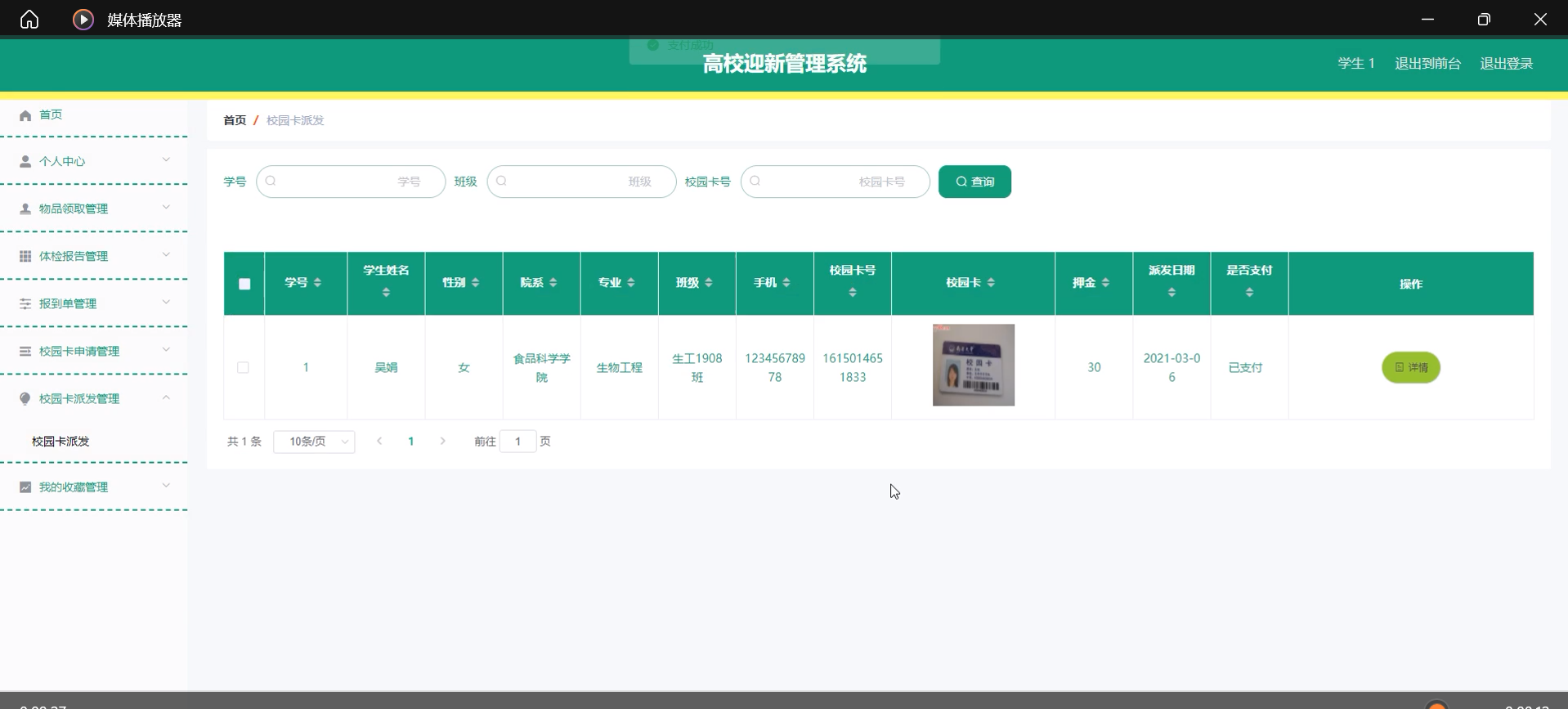 完成一套基于SpringBoot+Vue的高校迎新管理系统,具备迎新资讯、学生信息管理、体检报告、报到单、物品领取、校园卡申请等核心功能;