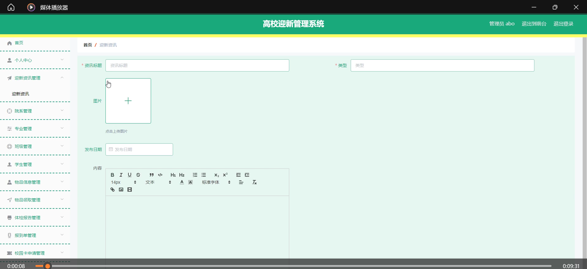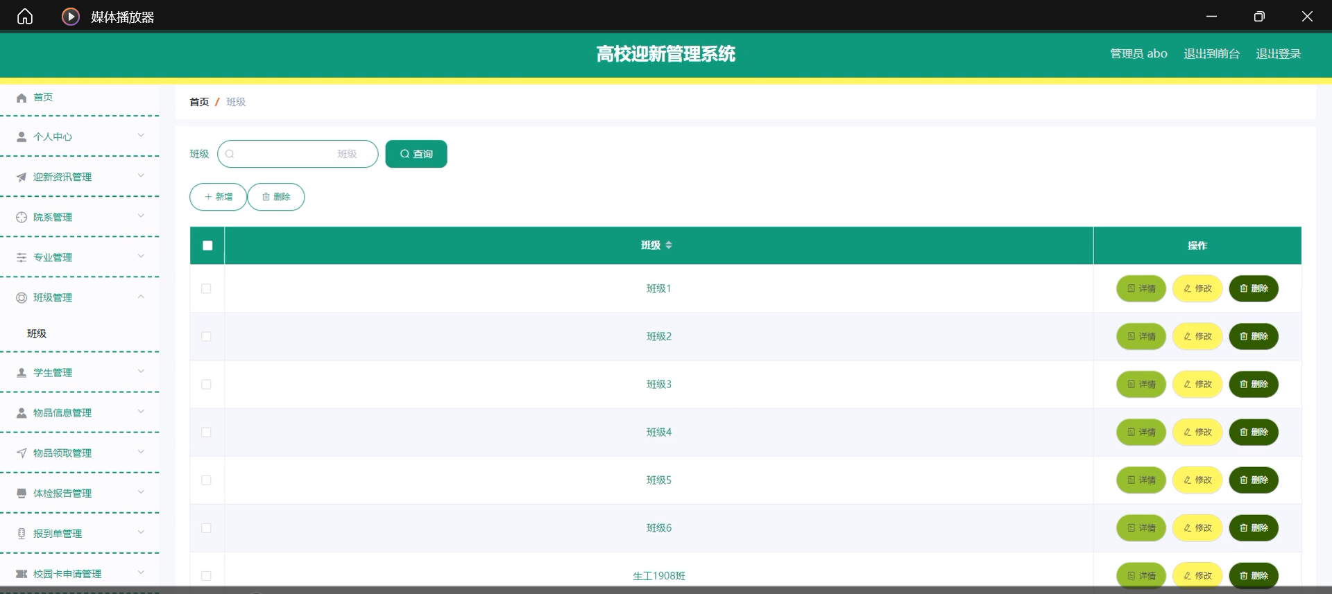 本研究围绕高校迎新工作的实际需求,设计并实现一套基于SpringBoot+Vue的迎新管理系统,系统主要功能包括迎新资讯发布、院系与专业信息管理、班级与学生信息录入与维护、体检报告上传与审核、报到单生成与打印、物品信息管理与领取登记、校园卡在线申请与派发等模块。
