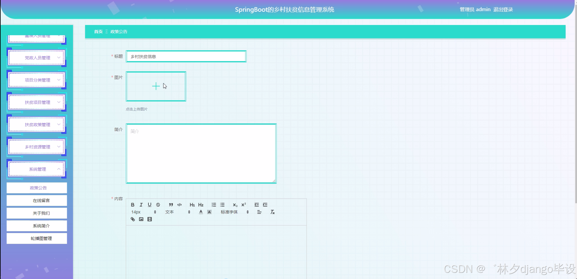 - 系统原型 成功构建一个基于Python的乡村扶贫系统原型,实现扶贫人员、基层人员、党政人员、项目分类、扶贫项目、扶贫政策、创新扶贫等主要功能模块的基本功能。这个系统原型能够在测试环境下稳定运行,各个功能模块之间能够有效协同工作。