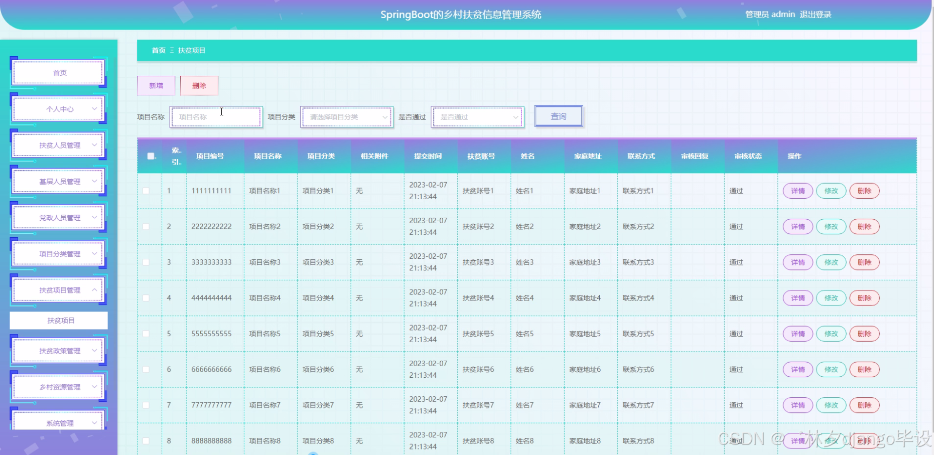 - 实现扶贫人员相关功能,如扶贫对象信息的录入、修改、查询,扶贫进度的实时更新等功能。