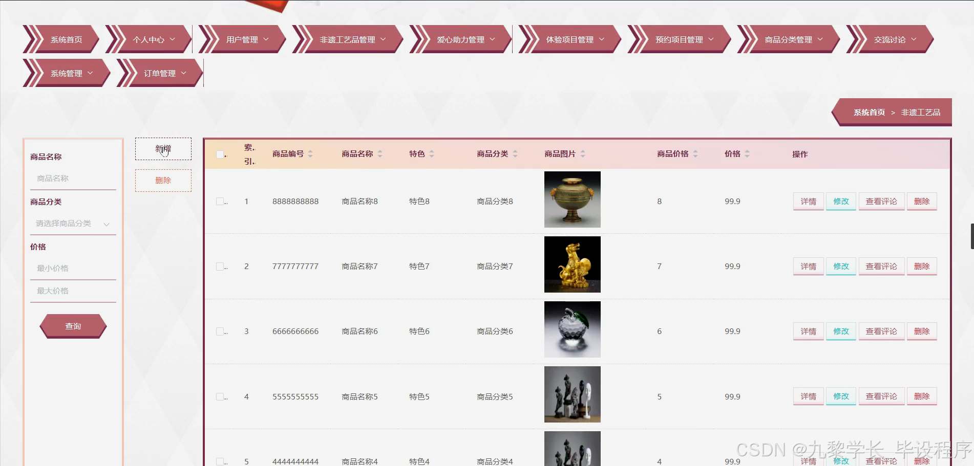 研究内容聚焦于非遗文化平台的系统设计与功能实现。首先,需构建用户系统,实现用户注册、登录、个人信息管理等功能,确保平台用户的安全与隐私。其次,非遗工艺品模块将展示各类非遗作品,包括详细介绍、制作工艺、文化背景等,便于用户深入了解。捐款记录模块将记录每一笔对非遗项目的捐赠,增强透明度与公信力。体验项目与预约项目模块则为用户提供亲身体验非遗技艺的机会,通过线上预约、线下参与的方式,拉近用户与非遗文化的距离。商品分类模块将非遗工艺品按类别整理,便于用户查找与购买。助力项目模块则鼓励用户通过分享、点赞等方式,为喜爱的非遗项目筹集资金与关注,形成线上线下联动,共同推动非遗文化的保护与传承。