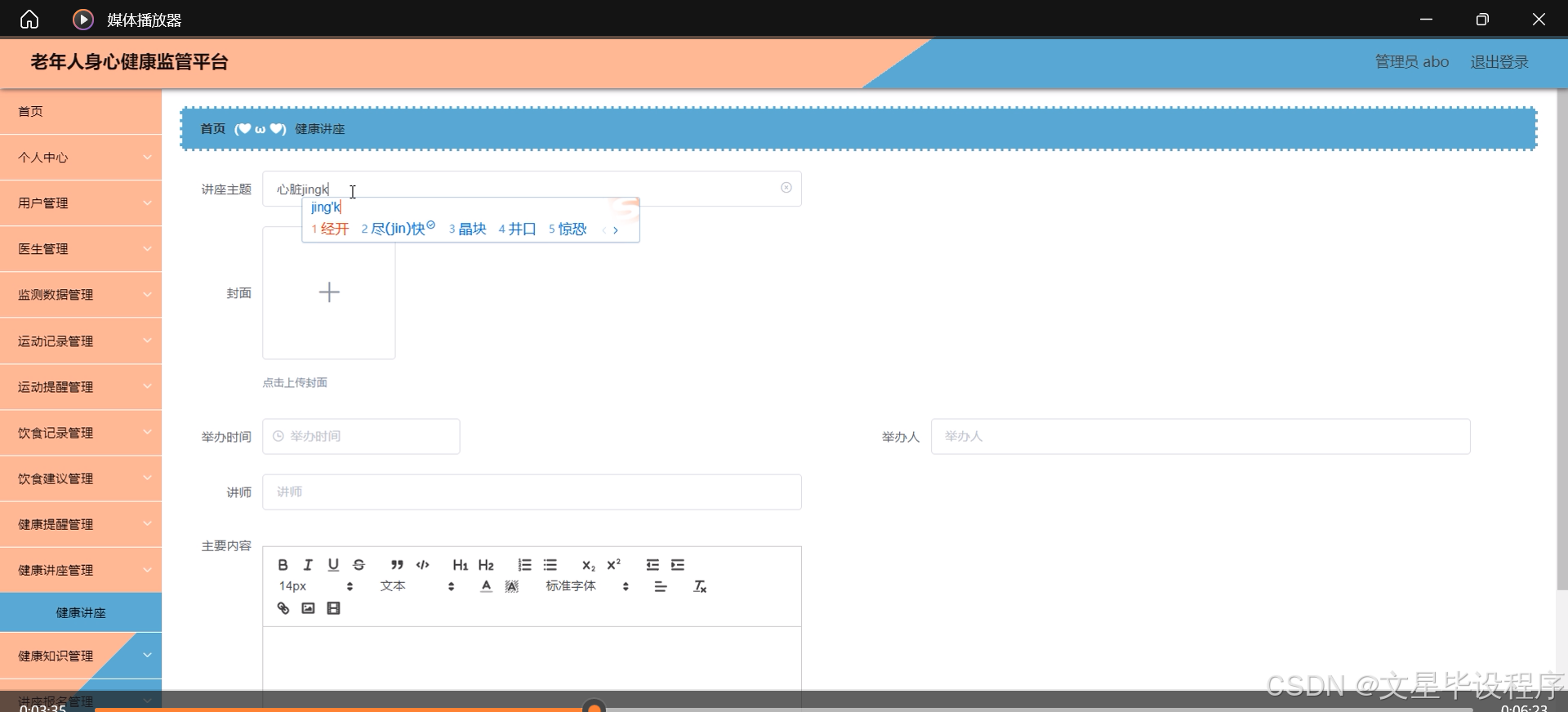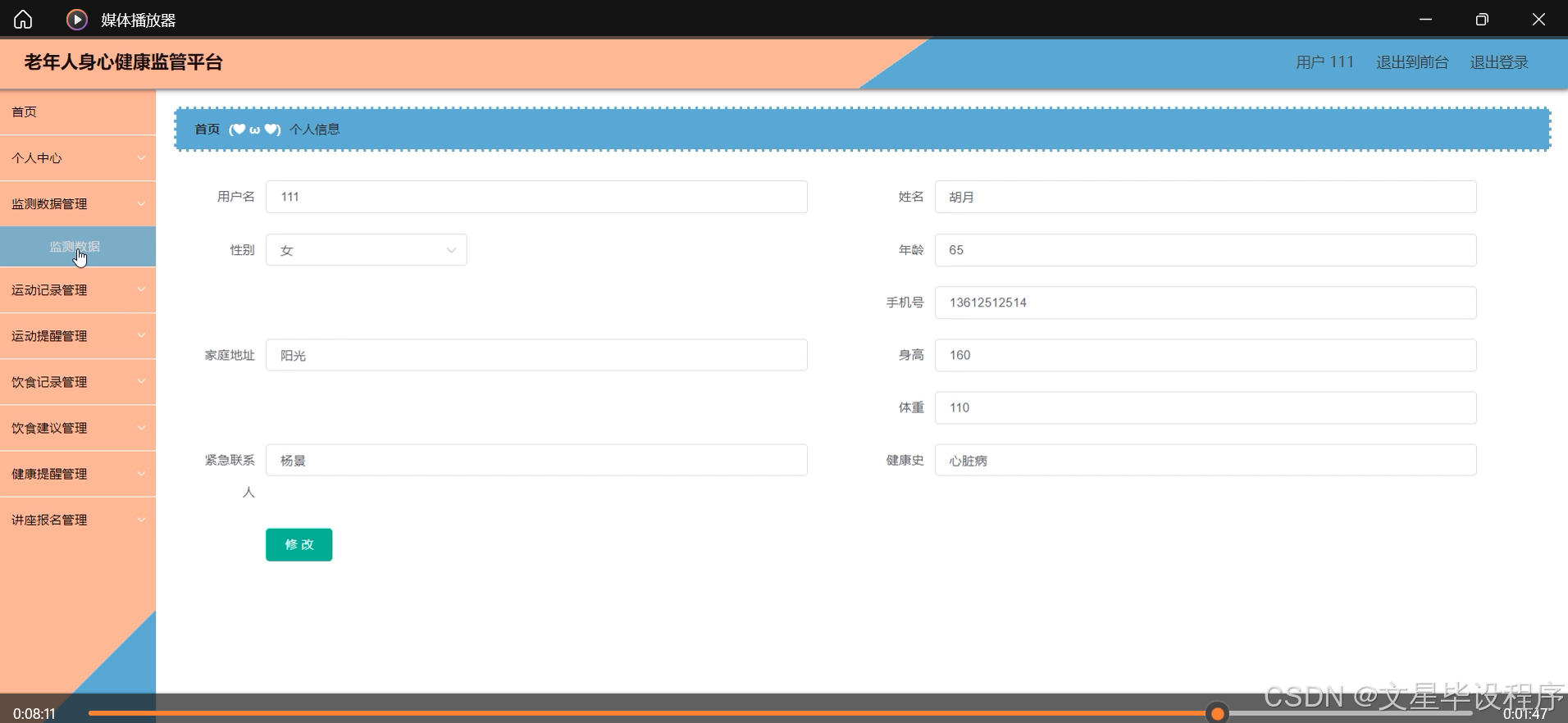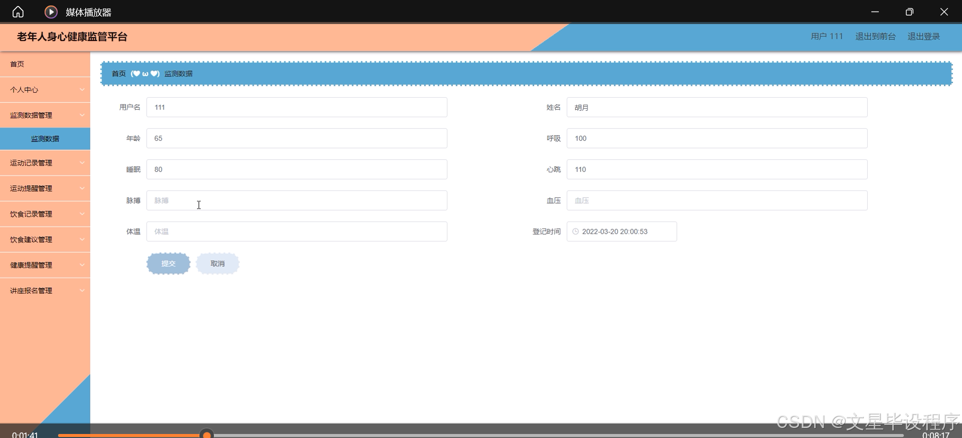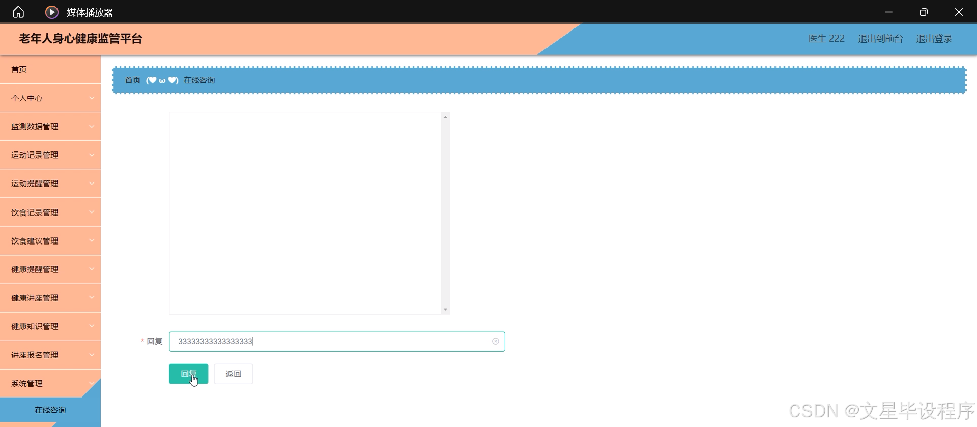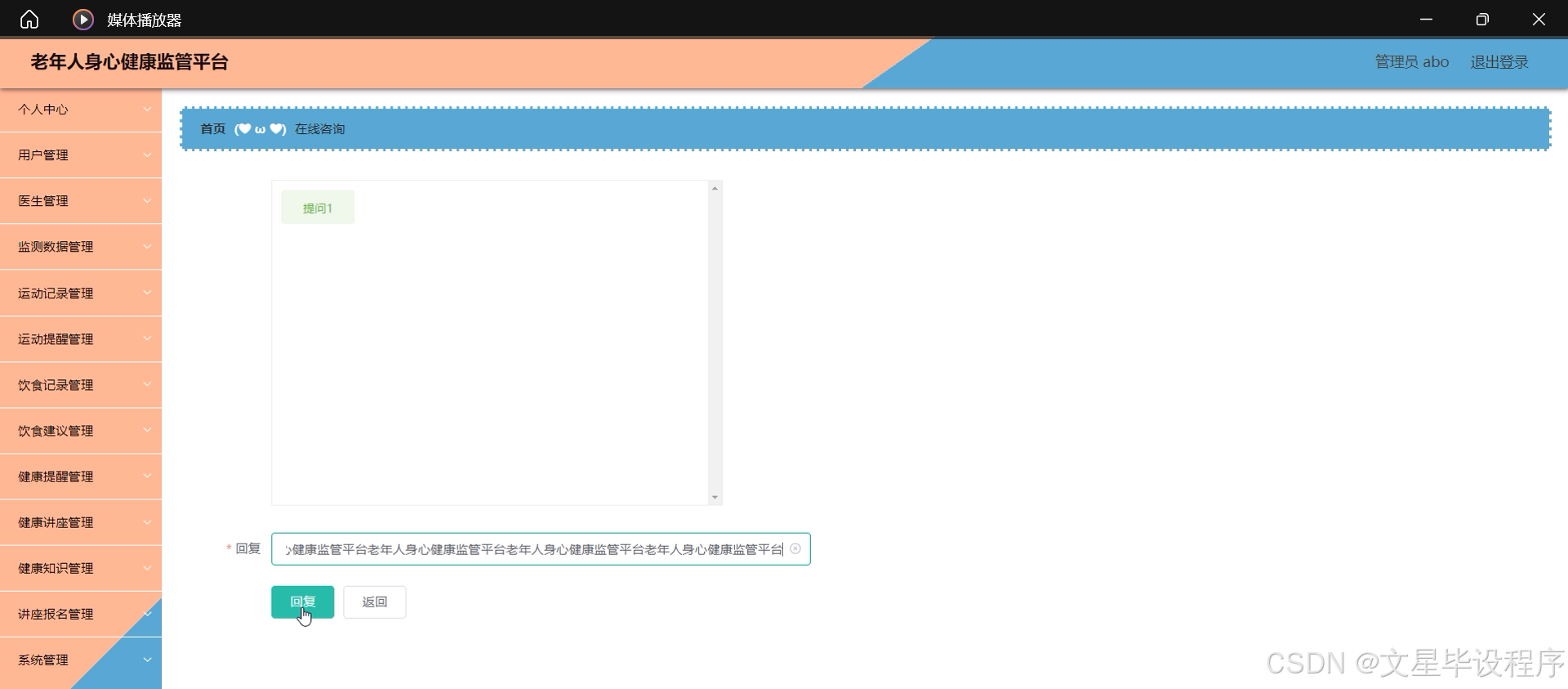 本研究内容主要围绕老年人身心健康监管平台的系统设计展开,具体包括用户管理、医生咨询、监测数据管理、运动记录与提醒、饮食记录与建议、健康提醒、健康讲座与知识推送、讲座报名等系统功能。通过这些功能的实现,平台能够全方位、多角度地关注老年人的身心健康状况,提供个性化的健康管理和服务方案,促进老年人的身心健康和全面发展。