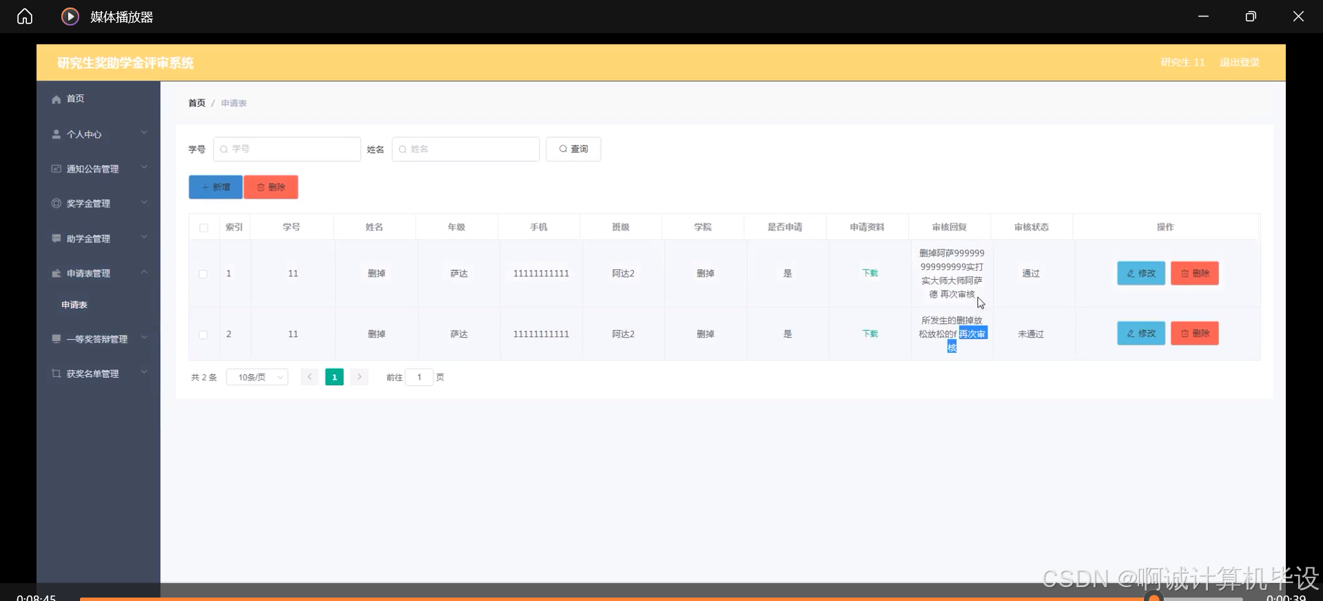 预期成果包括:一是完成基于SSM框架的研究生奖助学金评审系统的设计与实现,包括研究生信息管理、奖学金与助学金申请、申请表管理、教师评审、通知公告发布、综合评分计算等模块;二是通过系统测试与评估,验证系统的稳定性和安全性,确保系统能够满足实际需求并具备良好的用户体验;三是形成一份详细的毕业设计报告,总结研究成果和实践经验,为后续的研究和实践提供参考和借鉴;四是为高校研究生教育提供一个高效、透明、公正的奖助学金评审平台,促进研究生教育的公平与公正。