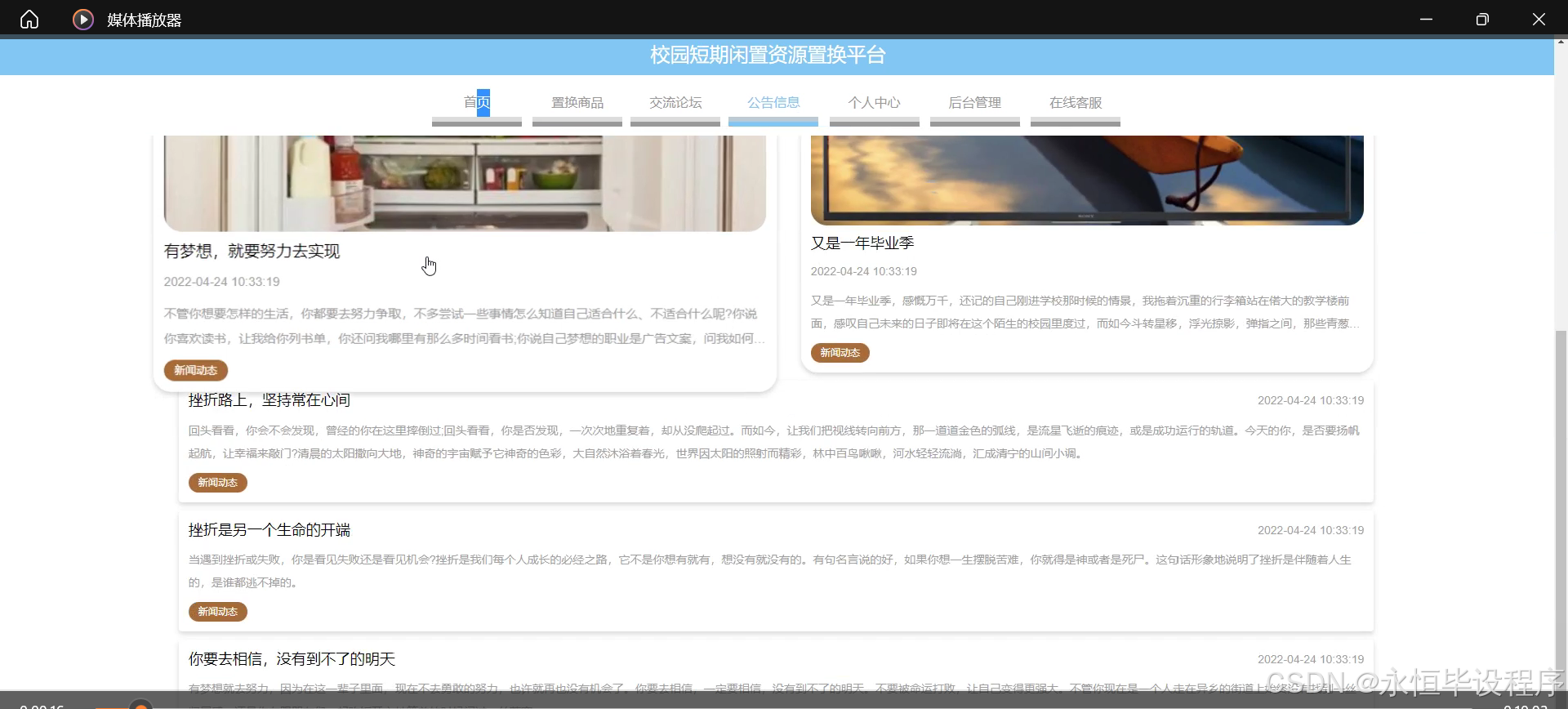 预期成果包括:完成一个基于SSM框架的校园短期闲置资源置换平台系统,实现上述所有功能;形成一份详细的系统设计文档和代码实现;通过系统测试和验证,确保系统的稳定性和可用性;撰写一篇毕业论文,详细阐述系统的设计思路、实现过程和测试结果;为校园短期闲置资源置换提供一个高效、便捷的管理工具,促进资源的有效利用和循环流动,提升校园生活的质量和效率。