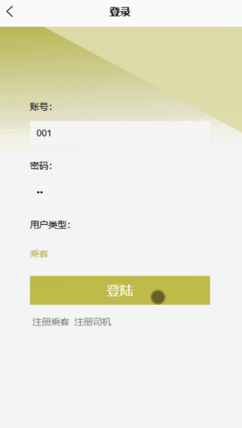 司机登录界面,首先双击打开微信小程序端系统,连上网络之后会显示出本系统的登录界面,这是进入小程序的第初始页面“登录”,能成功进入到该登录界面则代表小程序的开启是成功的,接下来就可以操作本系统所带有的其他所有的功能,如图5.8所示:
