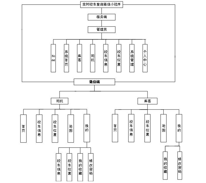 实时校车查询微信小程序主要有管理员和、乘客、司机,三个功能模块:管理员服务端乘客、司机微信端。以下将对这三个功能的作用进行详细的剖析[11]。
