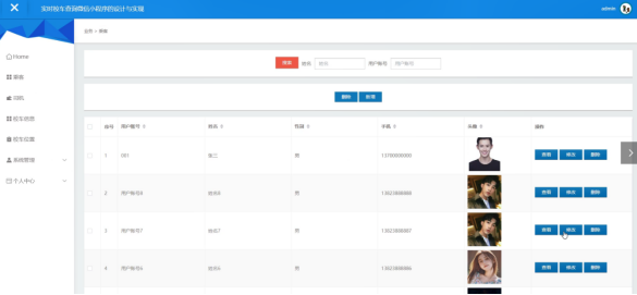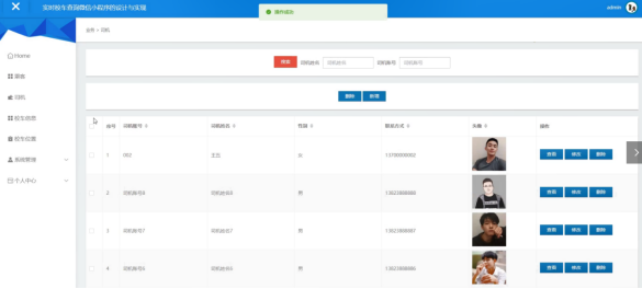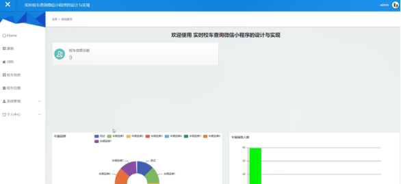 管理员进入系统主页面,主要功能包括对Home、系统首页、乘客、司机、校车信息、校车位置、系统管理、个人中心等进行操作。管理员主页面如图5-13所示: