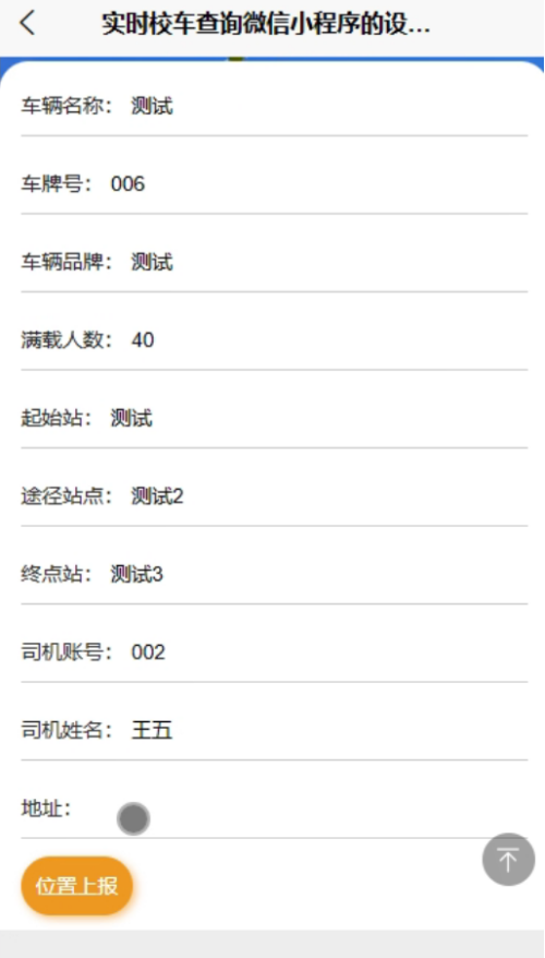 司机点击校车信息,在校车信息页面的输入栏填写车辆名称,进行搜索,还可以查看校车等信息,如果有需要可以点击位置上报等操作,如图5.10所示:
