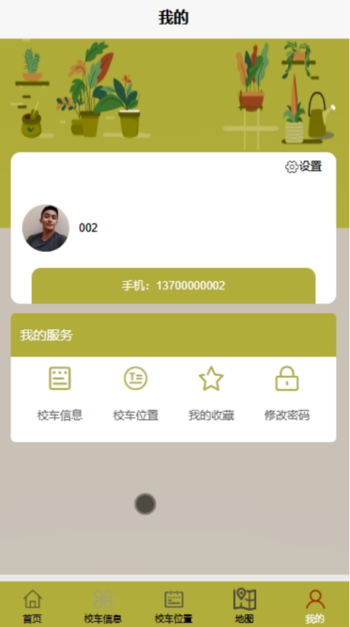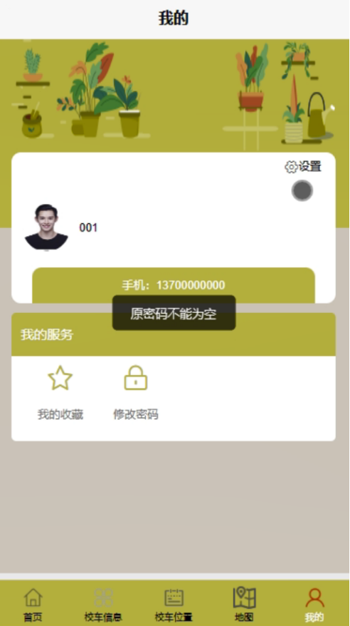 在我的功能界面,司机点击“我的”进入我的页面,在我的页面可以对校车信息、校车位置、我的收藏、修改密码等进行详细操作,如图5.11所示: