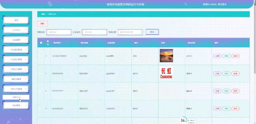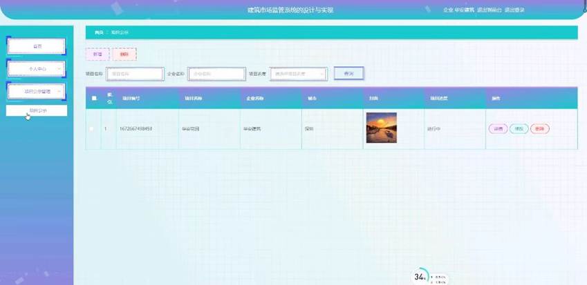 管理员点击项目公示管理。在项目公示页面输入项目名称,企业名称和选择项目进度进行查询或删除项目公示列表,并根据需要对项目公示详情信息进行详情、修改或删除操作;如图5-10所示: