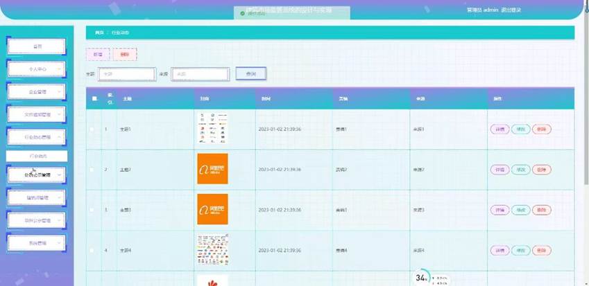管理员点击行业动态管理。在行业动态页面输入主题和来源进行查询、新增或删除行业动态列表,并根据需要对行业动态详情信息进行详情、修改或删除操作;如图5-8所示: