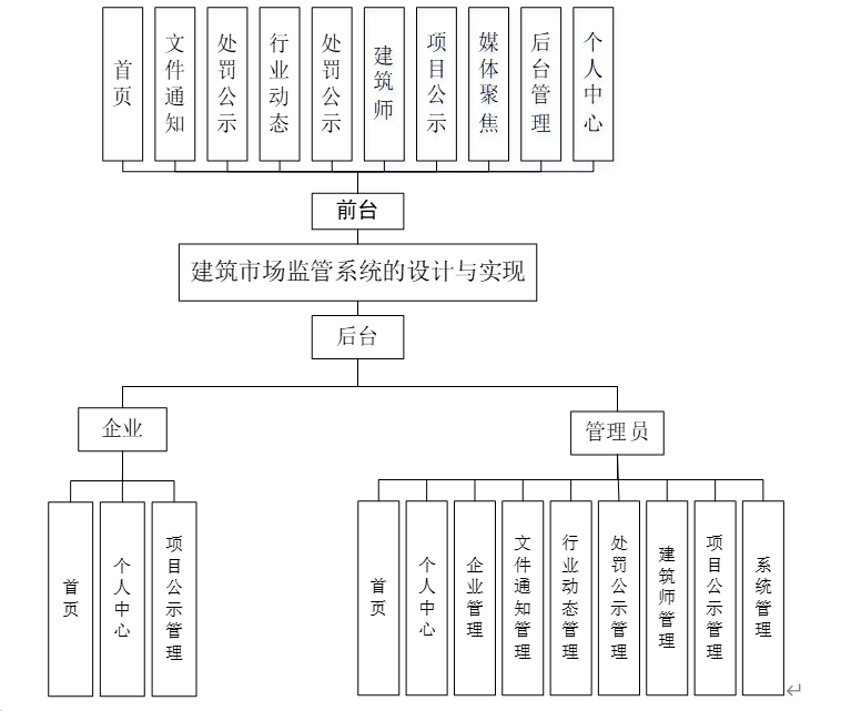 能够登录本系统的一共有两种角色,分别是管理员和企业。登录系统后,不同的角色可以对系统进行不同的操作,管理员拥有最大的权限。具体功能模块如图3-1所示。